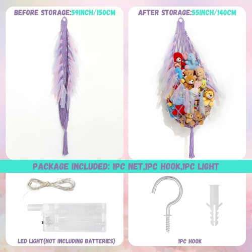 - Diverse Uses: it can not only easily store various small plush toys, but also hold bears or large plush toys ranging from 8 to 16 inches; In addition, it can also be applied to store throw pillows, towels, clothes, yoga balls and so on; It is also a fun way to showcase toys – transparent mesh fabric displays plush toys, and colorful tassels and LED lights add a playful charm to the bedroom or playroom