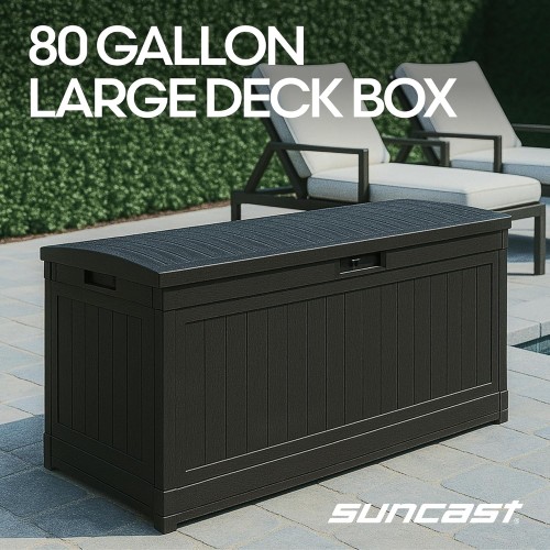 Suncast 80-Gal. Waterproof Resin Large Outdoor Patio Deck Box with Pad-Lockable Lid, Modern Outdoor Patio Bench/Storage Box for Cushions, Garden Tools, and More, Iron Ore