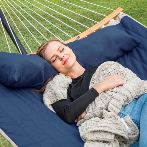 - Comfortable and Non-fading: Two-layer 100% quilted polyester fabric with poly fiber filling, cozier and best for camping and the outdoors. Compared with other quilted hammocks, it will not fade after long-term use. A polyethylene-stuffed head pillow offers superior comfort. You can even set your preferred height by hooking the suitable chain section to the hooks on the stand