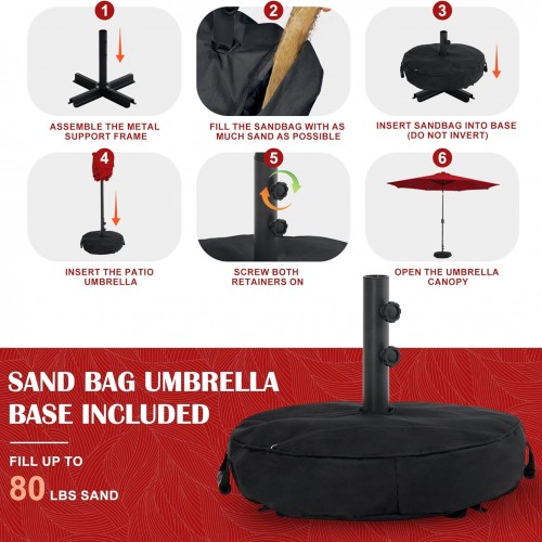 Sundale Outdoor Olefin 5-Year-Non-Fading Solar 80 LED 9 FT Solar Patio Umbrella with Sand Bag Base, Outdoor Umbrella with Tilt and Crank, Red