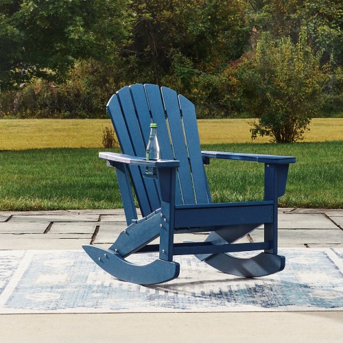 Add cottage-quaint charm to your outdoor oasis with this rocking chair in blue. Made of MEGA-TUFF® high-density polyethylene material, it’s sure to weather the seasons beautifully. Designed to shed rainwater, the chair’s slatted styling and classic Adirondack design provide exceptional form and function.
