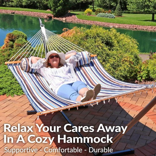 - VERSATILE HANGING OPTIONS: The quilted hammock features attached chains for easy hanging. This two person hammock swing can be tied between trees, poles, or used with a 12′ to 15′ hammock stand (not included). It’s wonderful for a variety of indoor or outdoor locations including the backyard, campsite, patio, sunroom, or bedroom.