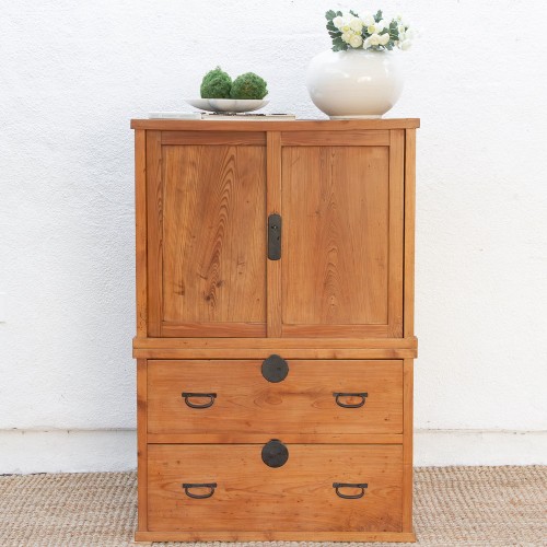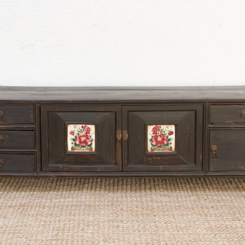This low-slung, striking cabinet is a rare and unique piece of history, rich with utility and charming detail. This Antique Kang Cabinet, a traditional piece of furniture from Northern China, is characterized by its long, low profile, originally designed to sit atop a heated brick platform (kang). Likely dating to the 20th century, the piece wears a beautifully distressed black painted finish that highlights the rich texture of the wood. Its design is a masterpiece of utility, featuring multiple drawers flanking a central two-door compartment, perfect for organized storage. The most captivating feature is the hand-painted floral ceramic tiles inset into the doors, adding an unexpected and vibrant burst of color.