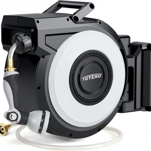 Tuyeho Retractable Garden Hose Reel 130 FT, Wall Mount Heavy Duty Water Hose Reels with Automatic Slow Rewind System, Outdoor Hoses Reel with 2 Hose Nozzles for Garden Watering, Car Wash, Pet Shower