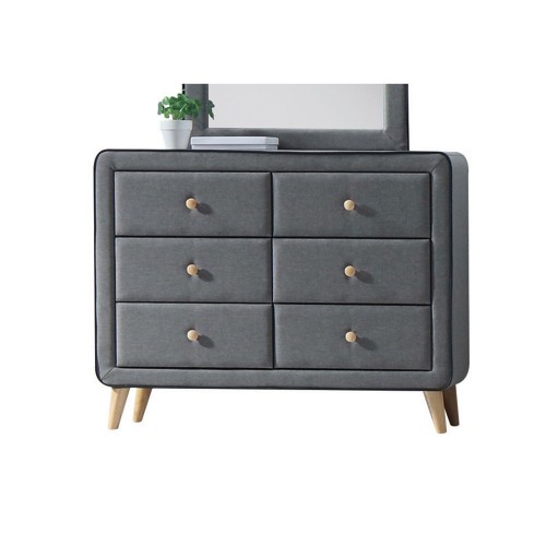 - Sophisticated Design: The light gray fabric with black welt trim and natural wood accents provide a warm, inviting contrast, enhancing the dresser’s timeless appeal and sophisticated appearance.