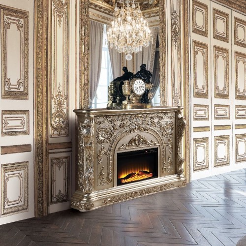 This sophisticated French-styled Vanaheim fireplace mantel is decorated with ornate carvings of flowers, scrolls, and classic acanthus to leave a lasting impression of elegance. The beautiful white finish is the perfect display for rich artistic details that are accentuated with hand-painted silver paint. The fireplace features a touch panel and a remote for ease of use. The fireplace functions include: Adjustable Temperature, Timer, & Light Only.