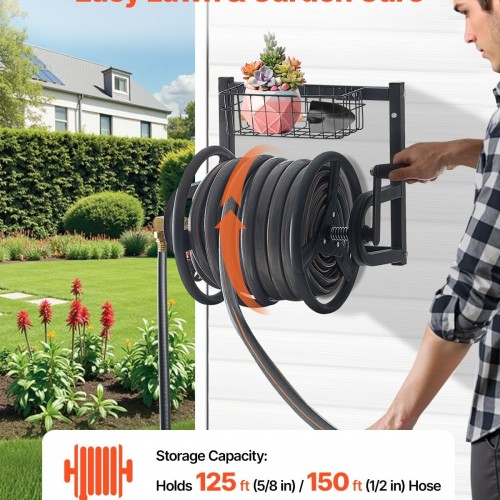 VEVOR Wall Mounted Garden Hose Reel, Holds 125 ft 5/8-inch Hose, Heavy-Duty Water Hose Winder, Space-Saving Design, Outdoor Manual Reel with Brass Fitting and Storage Basket for Yard Lawn