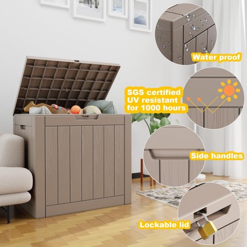 - YEAR-ROUND DEFENSE: The aggregate resin with a wood grain pattern on this deck storage box delivers a blend of beauty and functionality. It’s equipped with waterproof, UV-resistant, fade-resistant, rust-resistant, peel-resistant, and warp-resistant features, requiring minimal maintenance over the next several years