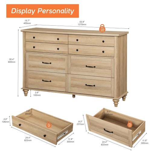 - 【8 Drawer Dresser with Ample Storage Space】54″×15.7″×35.4″(W×D×H). With four big drawers (size: 22.5″W×11.2″D×5.2″H) and four small drawers (size: 22.5″W×11.2″D×3.3″H), the wide dresser adds more storage space for kids’ clothing, toys and other items. And the 54 inch tabletop allows you to put TV or display decorations, potted plants, etc.