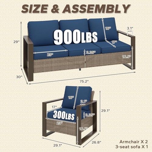 Wicker Patio 75″ Sofa Set with Two Armchairs, All Weather Rattan Outdoor Conversation Furniture Set with Wood-Looking Metal Armrest & Removable Cushions for Deck Backyard Porch, Dark Blue