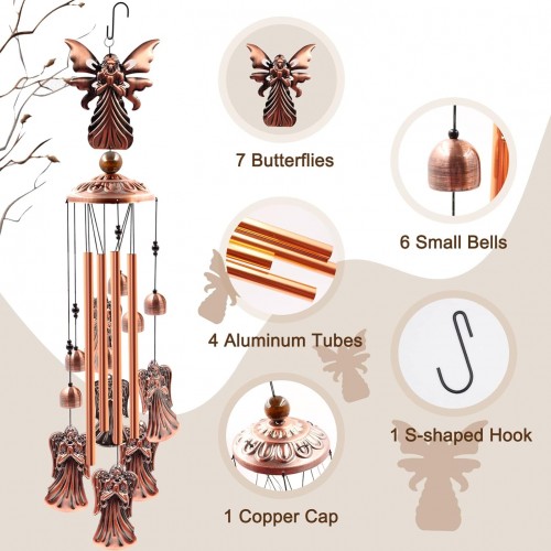 - UNIQUE DESIGN: This angel wind chimes for outdoors is purely handmade. It contains a large angel at the top, 6 small angels, 6 small bells, 4 rose gold durable and corrosion resistant aluminum tubes and 1 brass cap. A black nylon cord connects them together to form an elegant wind chime. Silver “S” shaped hooks allow you to hang the wind chimes on your patio or anywhere you wish.