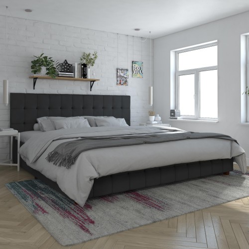 King Size Platform Bed Frame With Storage LED Light Headboard And Usb, Noise Free – Dark Gray